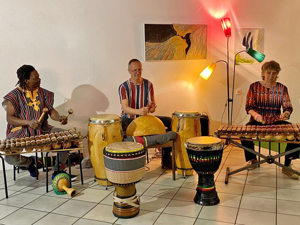 So versuchte ich zuerst über den Tanz dieser Musik näher zu kommen. Damit war der Sprung zur Djembe, den Douns und die Erweiterung auf die lateinamerikanischen Congas fast schon logische Weiterführung. Ich habe im Centre Rhythme Danse in Biel mit Luzi Schilling und Mamor Ndaye meine ersten afrikanische Rhythmen kennengelernt und spiele da auch live in den Tanzkursen…