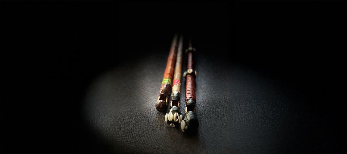 Hier seht ihr drei von Dedous Flöten mit verschiedener Stimmung. Die Flöte wird oft mit einer Technik geblasen, die Flötenklang und Stimme gleichzeitig erklingen lässt. Das bewirkt, dass die Flöten zu sprechen scheinen.